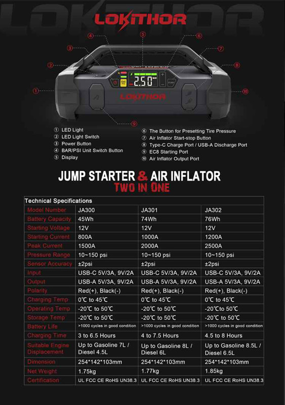 以上三種點(diǎn)火器都是JA產(chǎn)品,“JA”中的“J”代表跳躍啟動(dòng)器,而“A”代表充氣器。這三個(gè)產(chǎn)品可以滿足不同的規(guī)格要求,參數(shù)可以參考下面的圖片(當(dāng)然,來到現(xiàn)場(chǎng)近距離了解,會(huì)有更好更多的美好體驗(yàn))。